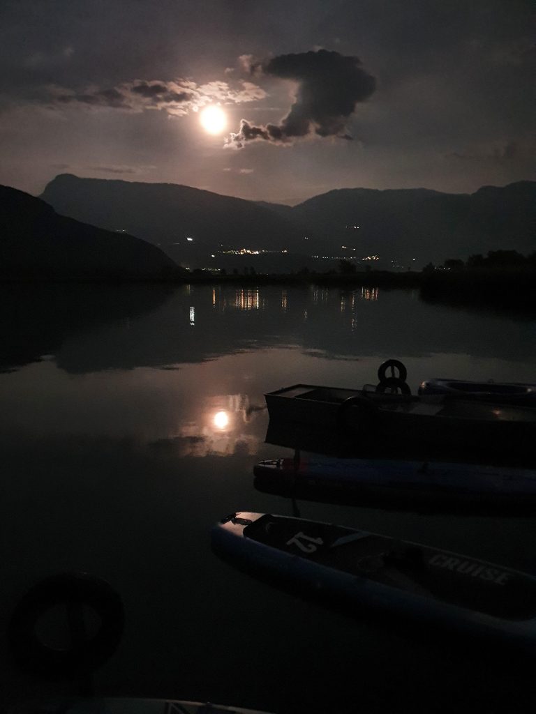 Als alles in und auf unserem Bus verpackt ist, starten wir zu unserer ersten Etappe der Südeuropa-Tour nach Kaltern. Die Fahrt ist entspannt und wir treffen am frühen Nachmittag in Kaltern am Campingplatz ein. Der Kalterer See ist schön gelegen und gar nicht so kalt, wie wir dachten. Allerdings schwimmen ziemlich große Fische direkt am Steg und machen Andreas Überlegungen in jedem Gewässer auf der Reise zumindest kurz zu baden umgehend zunichte. Abends genießen wir erst ein hervorragendes Abendessen im Restaurant des Campingplatzes und dann noch den Vollmond am See.
