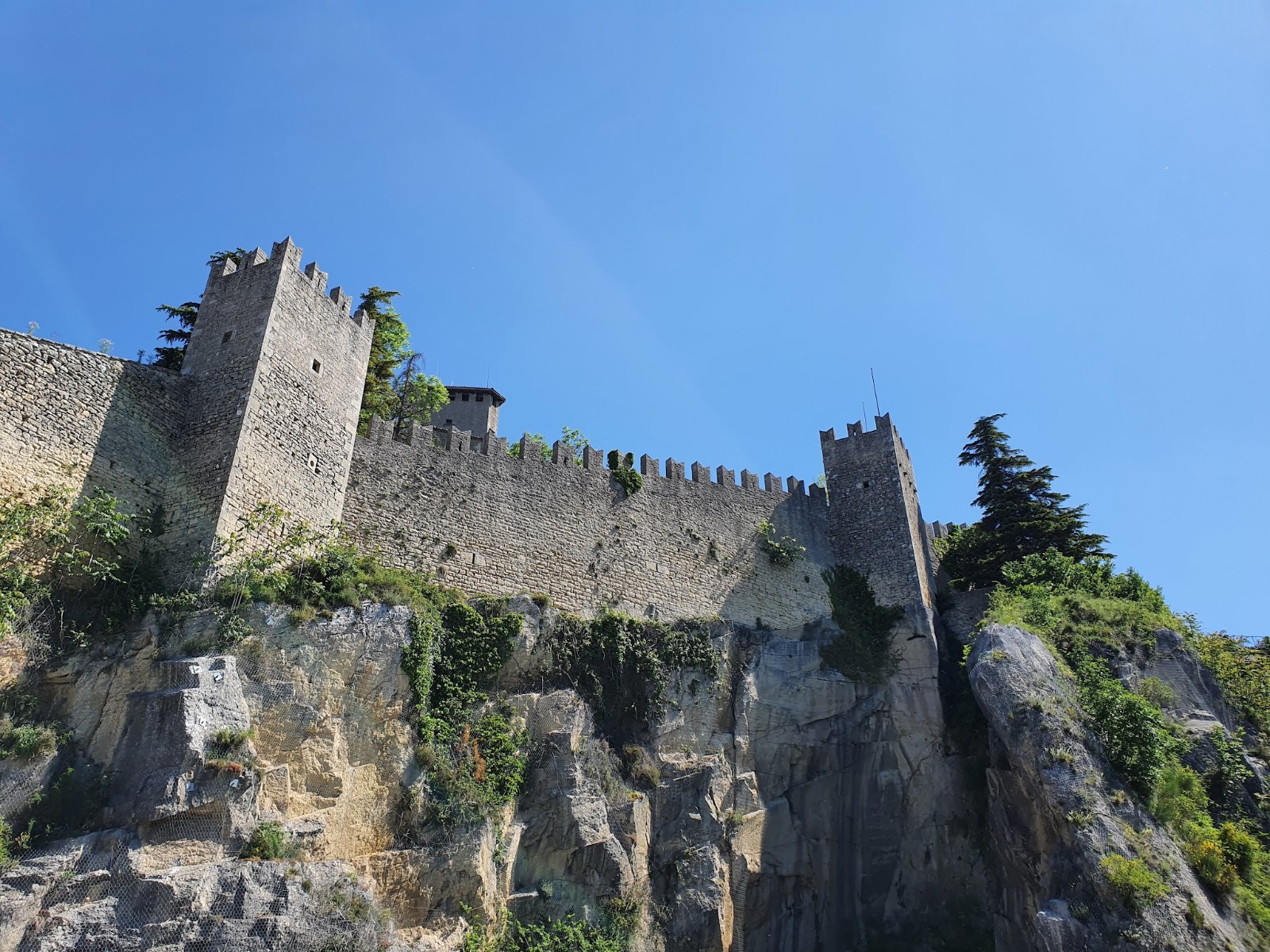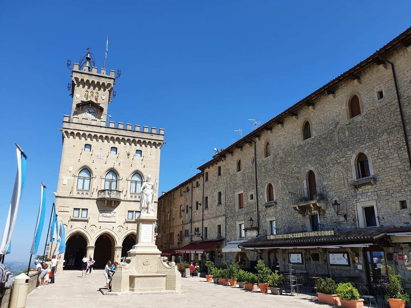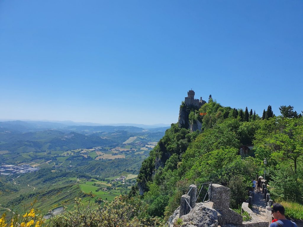 Mit dem (öffentlichen) Bus geht es ordentlich den Berg rauf in das historische San Marino. Von oben haben wir einen fantastischen Blick ins Hinterland und sehen auch bis zur Küste nach Rimini. San Marino hat 3 Türme, die wir auch alle nacheinander ansteuern und (zumindest von außen) bestaunen. Nachdem wir alle Gässchen besichigt haben, steuern wir auf die Bushaltestelle zu um den Heimweg anzutreten. Der Fahrplan erinnert uns ein bisschen an Griechenland: die Zeiten auf dem Fahrplan, den wir von der Rezeption erhalten haben unterscheiden sich von den Zeiten auf dem Fahrplan an der Bushaltestelle und tatsächlich fährt der Bus zu einer ganz anderen Zeit. Auch in Punkto Fahrstil stehen die Marinesen den Griechen in nichts nach ;-).