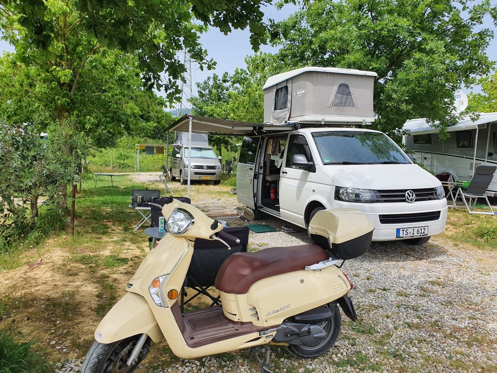 Die Plätze haben wir telefonisch schon mal von unterwegs reserviert und am Campingplatz können wir sofort erkennen, wer sein Gefährt beherrscht und wer eher nicht. Die Plätze sind sehr schön und zum Teil mit Wein überwachsen, aber es ist auch richtig knapp zum Einparken. Sobald wir in den Platz einfahren, kommt auch schon ein offizieller Einweiser herbei und dirigiert Willi und Armin fachmännisch in die Plätze. Die verstehen ihr Handwerk ausgezeichnet, sodass wir fachmännisch in die schönen Plätze reinkommen. Um den Roller von der Rampe runterzubrigen lassen wir die letzten Zentimeter aufgrund der heimeligen Einhausung einfach die Muskeln spielen und heben ihn runter.